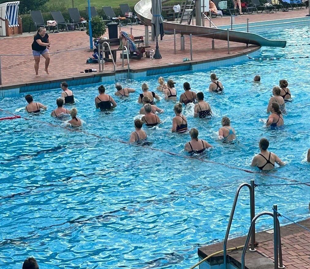 Die Wassergymnastik richtet sich an alle Altersgruppen und ist ideal für Einsteiger und Wiedereinsteiger. Die erste Einheit fand am Sonntagmorgen bei bestem Wetter statt und stieß bereits auf reges Interesse.